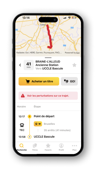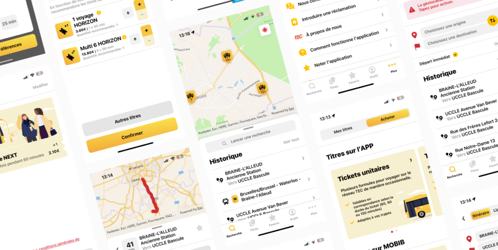 We have developed a new mobile application designed to provide enhanced guidance to travelers throughout their journeys. This application offers key features that elevate the overall experience. It notably includes an interactive and playful map that simplifies navigation, integrating a NFC card reader (Mobib) for seamless use.